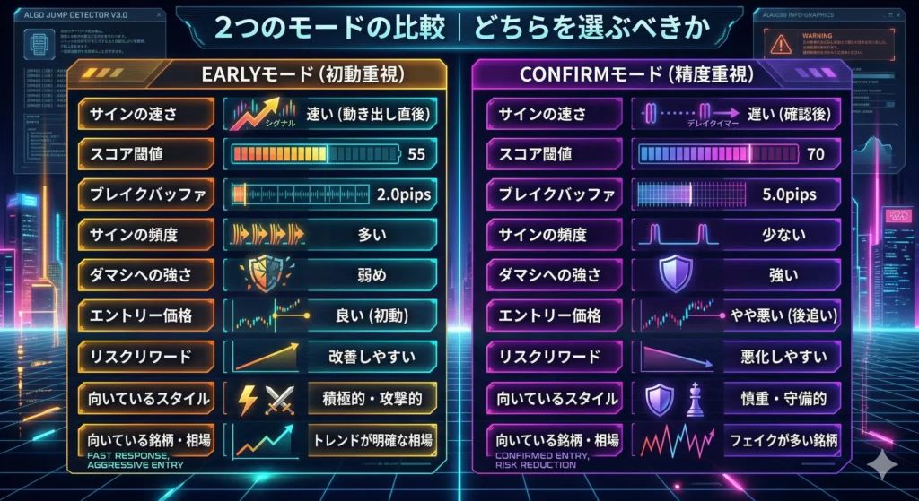 そしてこのインジ最大の特徴が、「どのタイミングでサインを出すか」を2つのモードで選べる点です。それが EARLYモード(初動重視) と CONFIRMモード(精度重視) です。