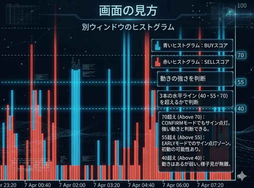 青いヒストグラムがBUYスコア、赤いヒストグラムがSELLスコアです。3本の水平ラインが引かれており(40・55・70)、どのラインを超えるかで動きの強さを判断できます。