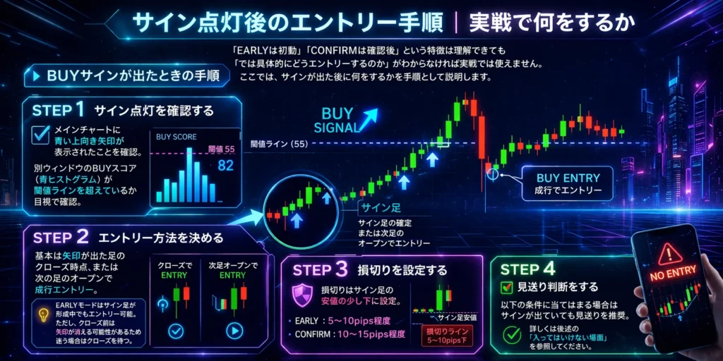 「EARLYは初動」「CONFIRMは確認後」という特徴は理解できても、「では具体的にどうエントリーするのか」がわからなければ実戦では使えません。ここでは、サインが出た後に何をするかを手順として説明します。