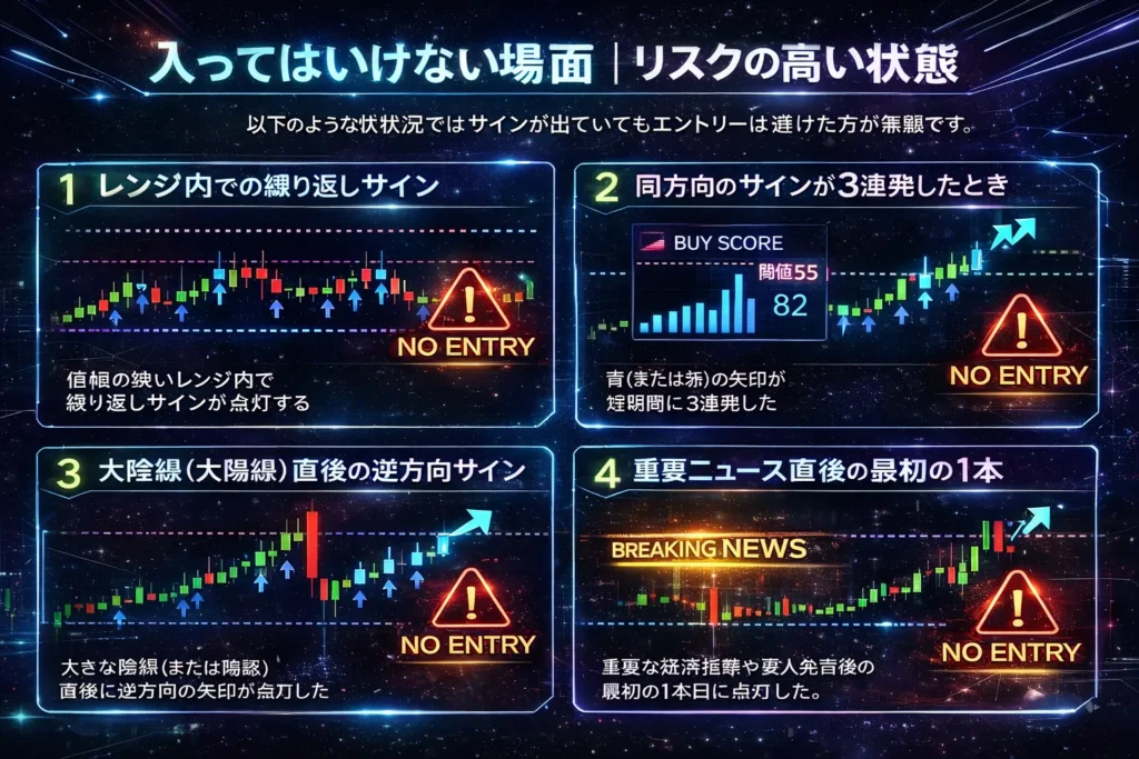 ⚠ 対処法: 重要ニュース直後の最初の1〜2本はサインが出ても見送ります。値動きが落ち着いてから出るサインに乗る方が安全です。