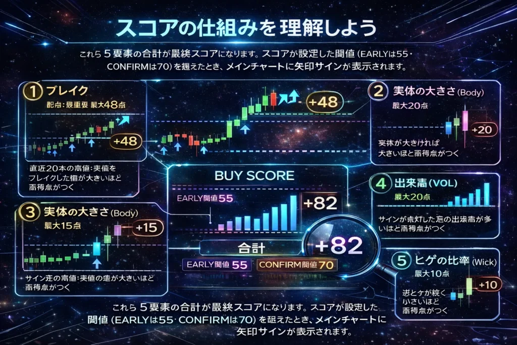 これら5要素の合計が最終スコアになります。スコアが設定した閾値(EARLYは55、CONFIRMは70)を超えたとき、メインチャートに矢印サインが表示されます。
