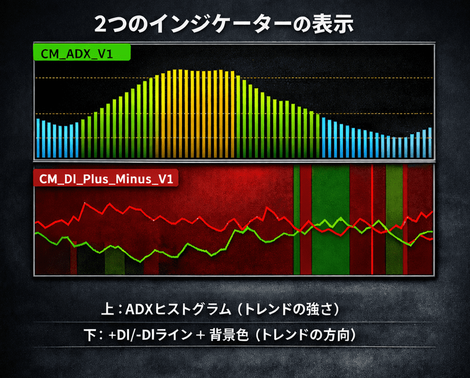 CM_ADX_V1だけでは「トレンドが強い」ことはわかりますが、「上昇トレンドか下降トレンドか」がわかりません。CM_DI_Plus_Minus_V1の背景色で方向を確認することで、完全なトレード判断が可能になります。