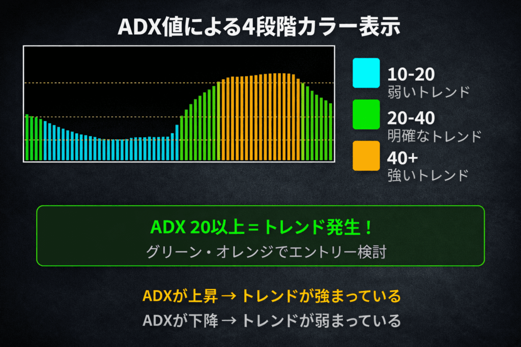 ポイント:ADX ≥ 20 = トレンド発生!グリーン・オレンジでエントリー検討