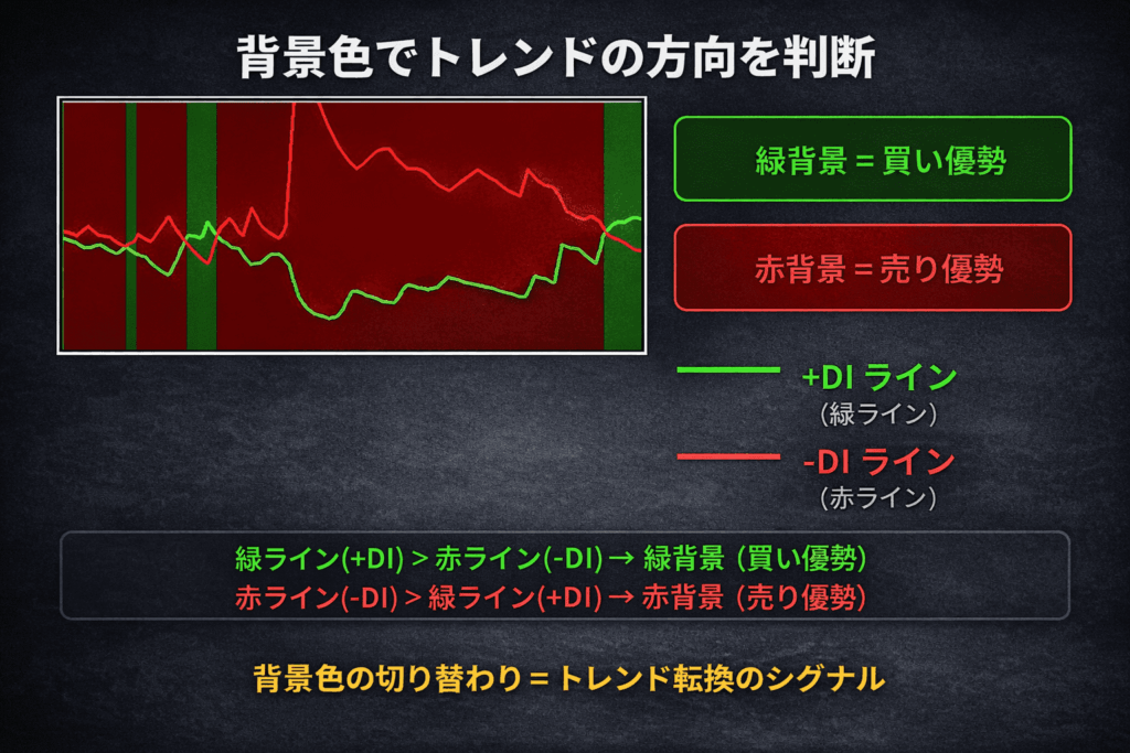 | 赤背景 | -DI > +DI | 売り優勢(下降トレンド) |