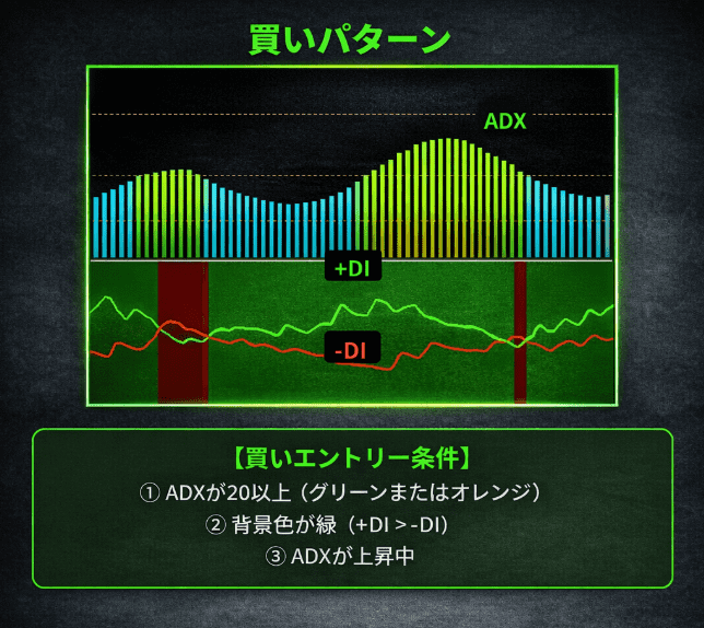 - ADX ≥ 20 + 緑背景 = 買いパターン