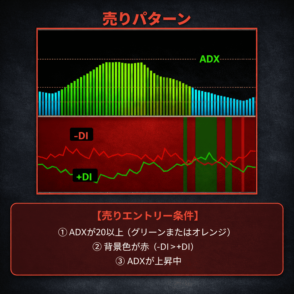 - ADX ≥ 20 + 赤背景 = 売りパターン