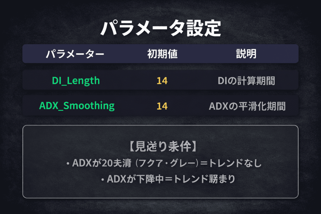 | ADX_Smoothing | 14 | ADXの平滑化期間 |