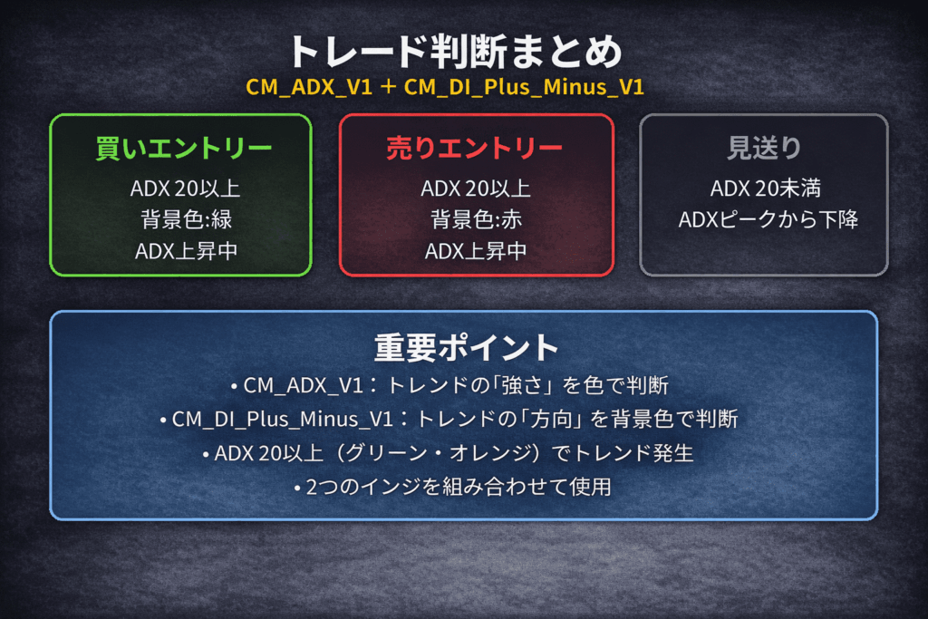 - ADXは「強さ」のみ → 方向はDI背景色で判断