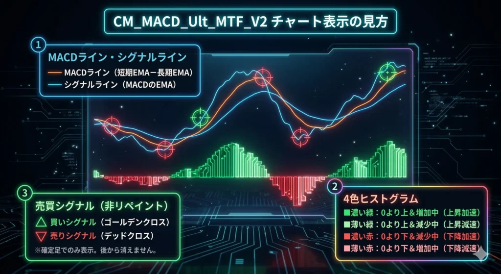 | MTF対応 | 上位足(例:4時間足)のMACDを現在チャートに表示 |