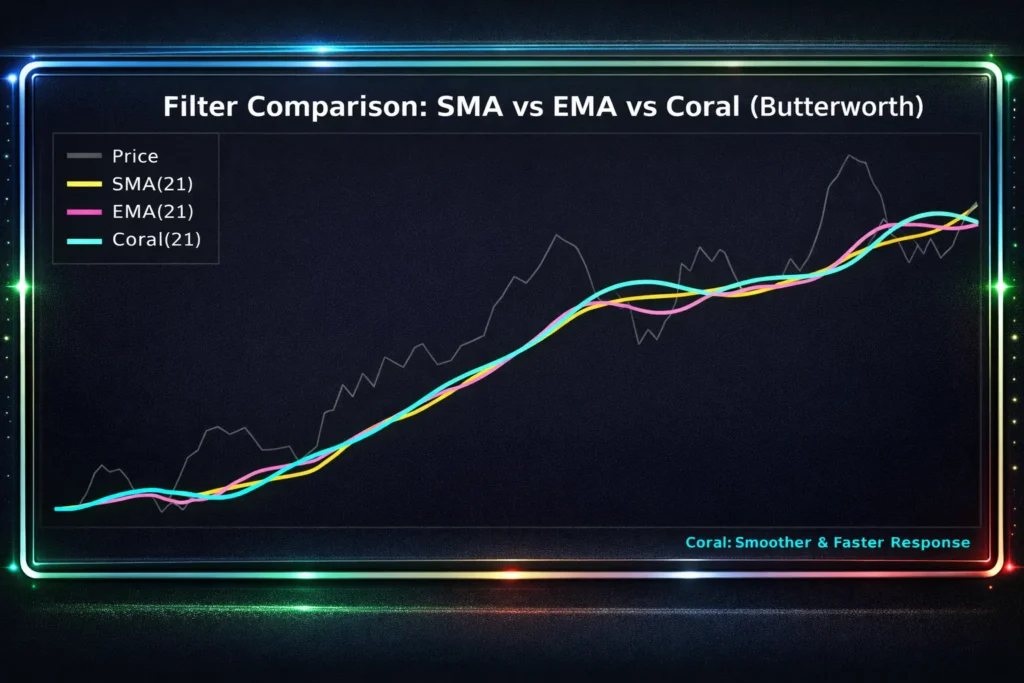 結論:Coral Trend Indicatorは、6段階のEMAチェーンとButterworth係数を組み合わせることで、滑らかなトレンドラインを生成します。