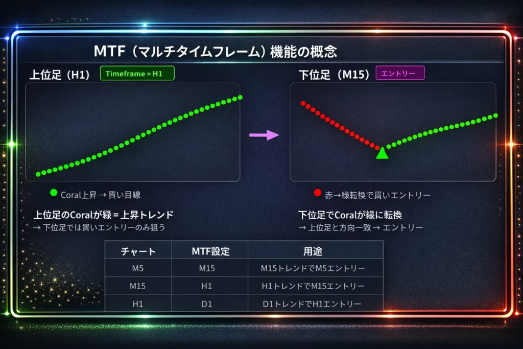 トレードで勝率を上げるには上位足のトレンド方向に沿ったエントリーが重要です。MTF機能を使えば、例えば5分足チャートに日足のCoralラインを表示し、大きなトレンドを確認しながら短期足でエントリーポイントを探すことができます。