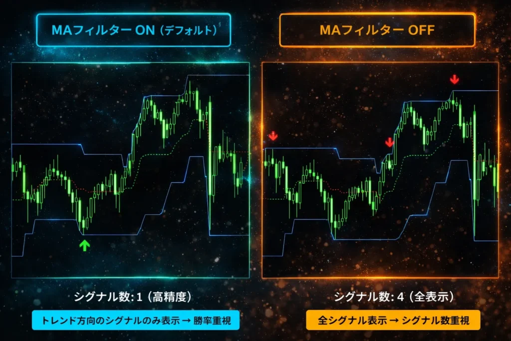 • MAフィルターが無効になり、トレンド方向に関係なく全シグナルが発生