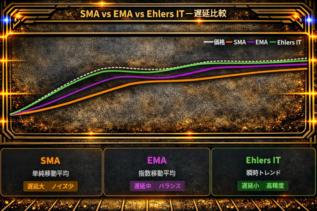 | 比較項目 | 単純移動平均(SMA) | 指数移動平均(EMA) | Ehlers IT |