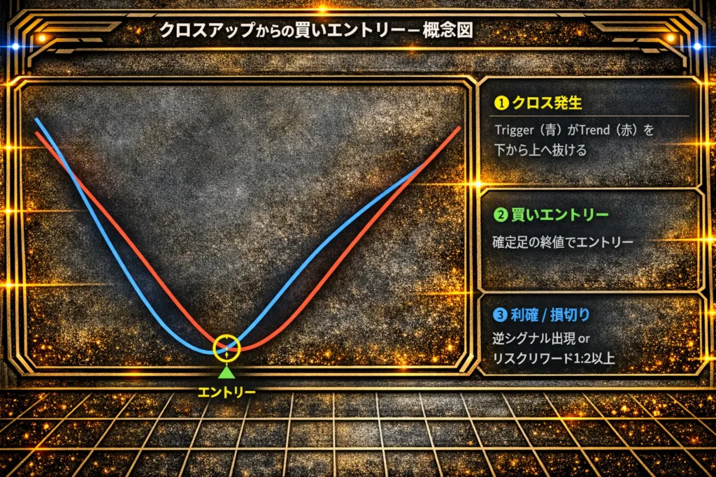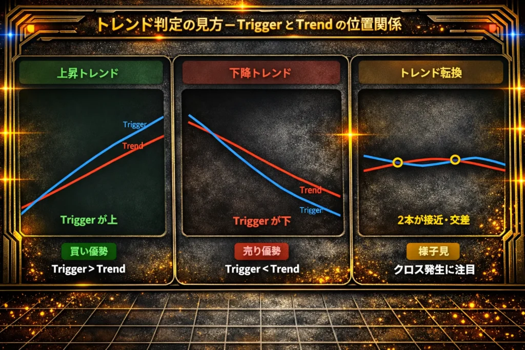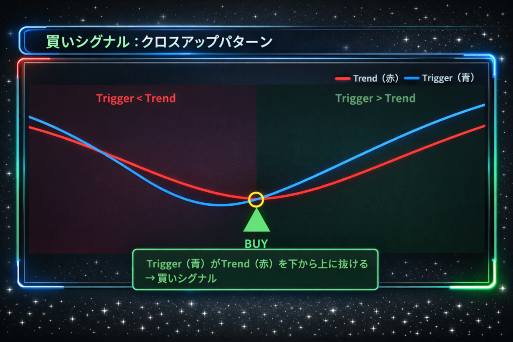 | 🟢 買いシグナル | 前足でTrigger ≤ Trend かつ 現在確定足でTrigger > Trend |