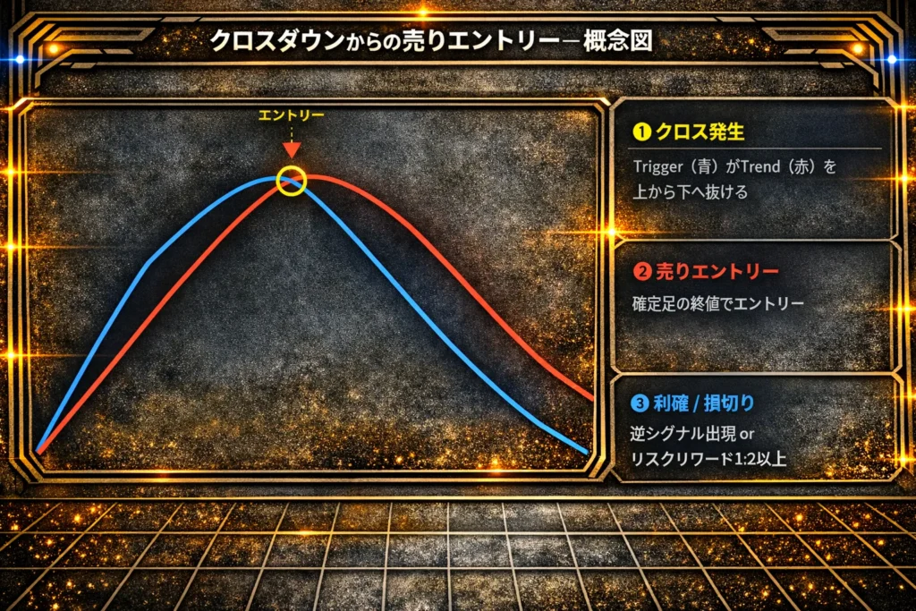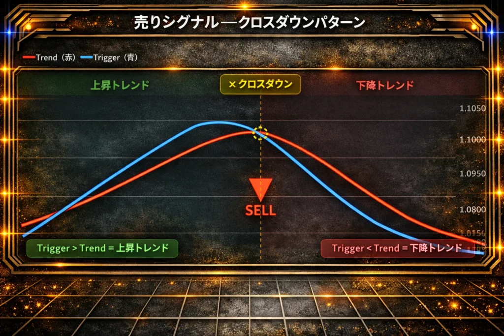 | 🔴 売りシグナル | 前足でTrigger ≥ Trend かつ 現在確定足でTrigger < Trend |