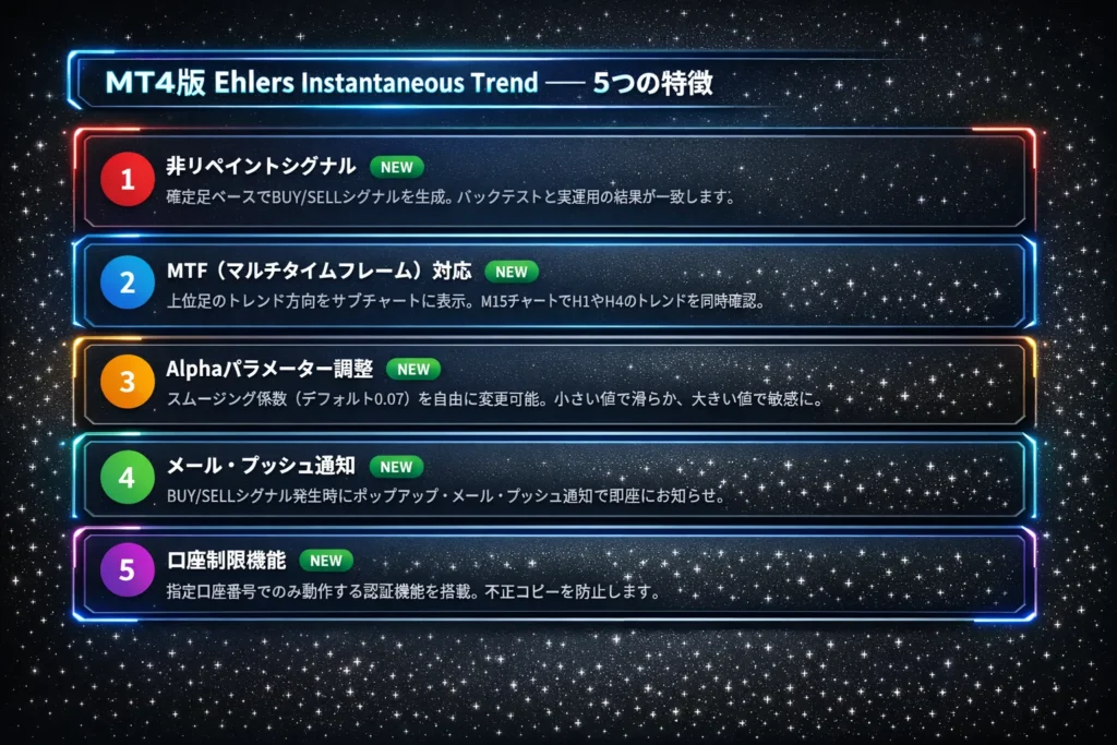 | 低遅延トレンドライン | IIRフィルターで高周波ノイズを除去 | 従来のMAより早くトレンド検出 |