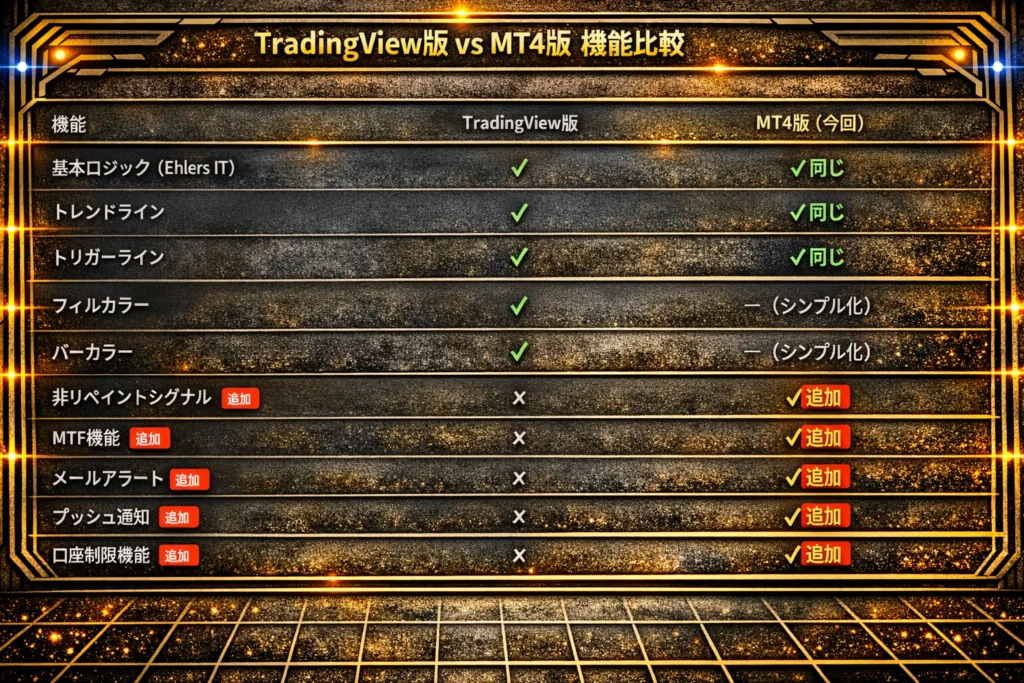 今回のMT4版は、TradingViewのEhlers Instantaneous Trend [LazyBear]をベースに大幅なカスタマイズを施しています。