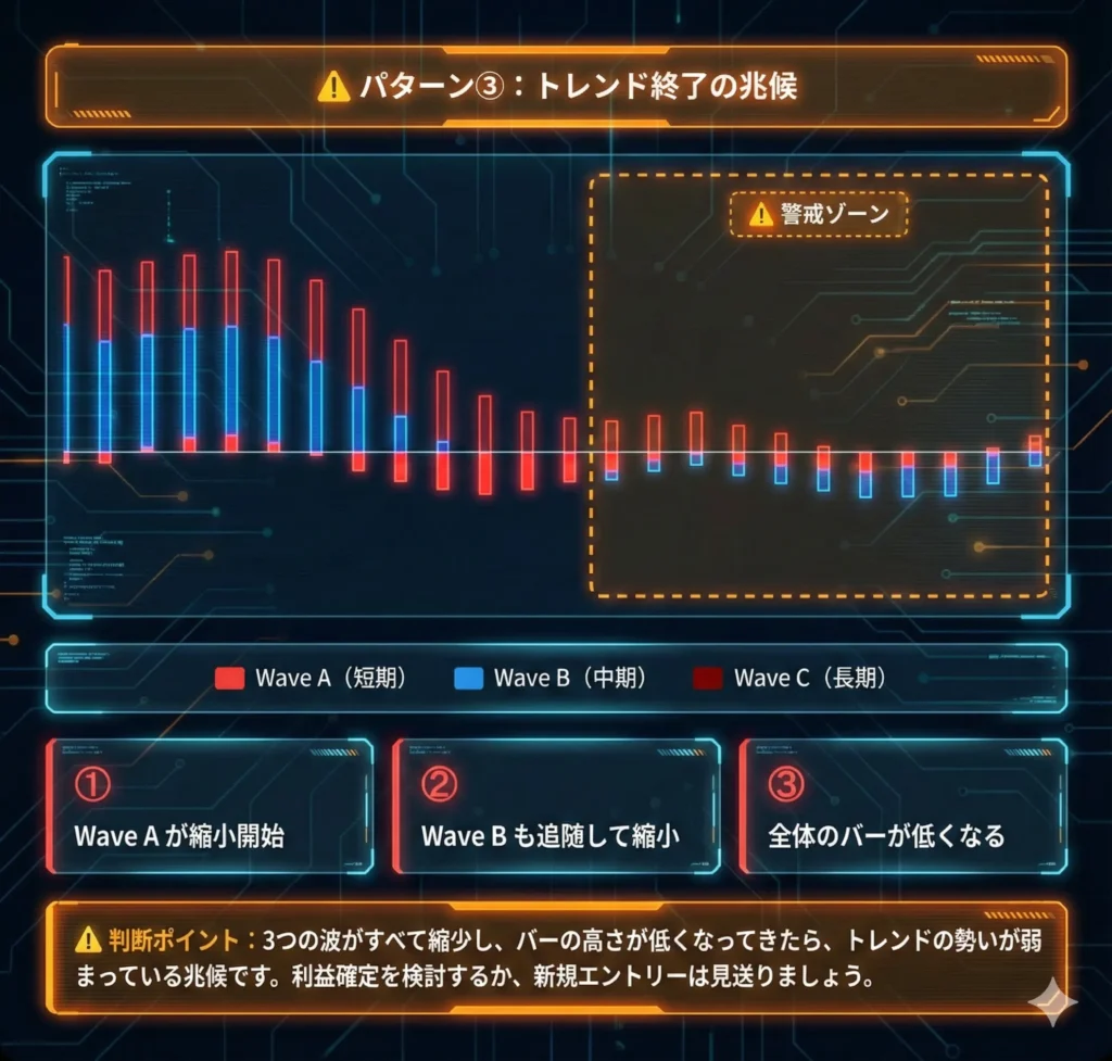 結論:3つの波の「方向」「高さ」「並び順」を見ることで、トレンドの状態を判断できます。