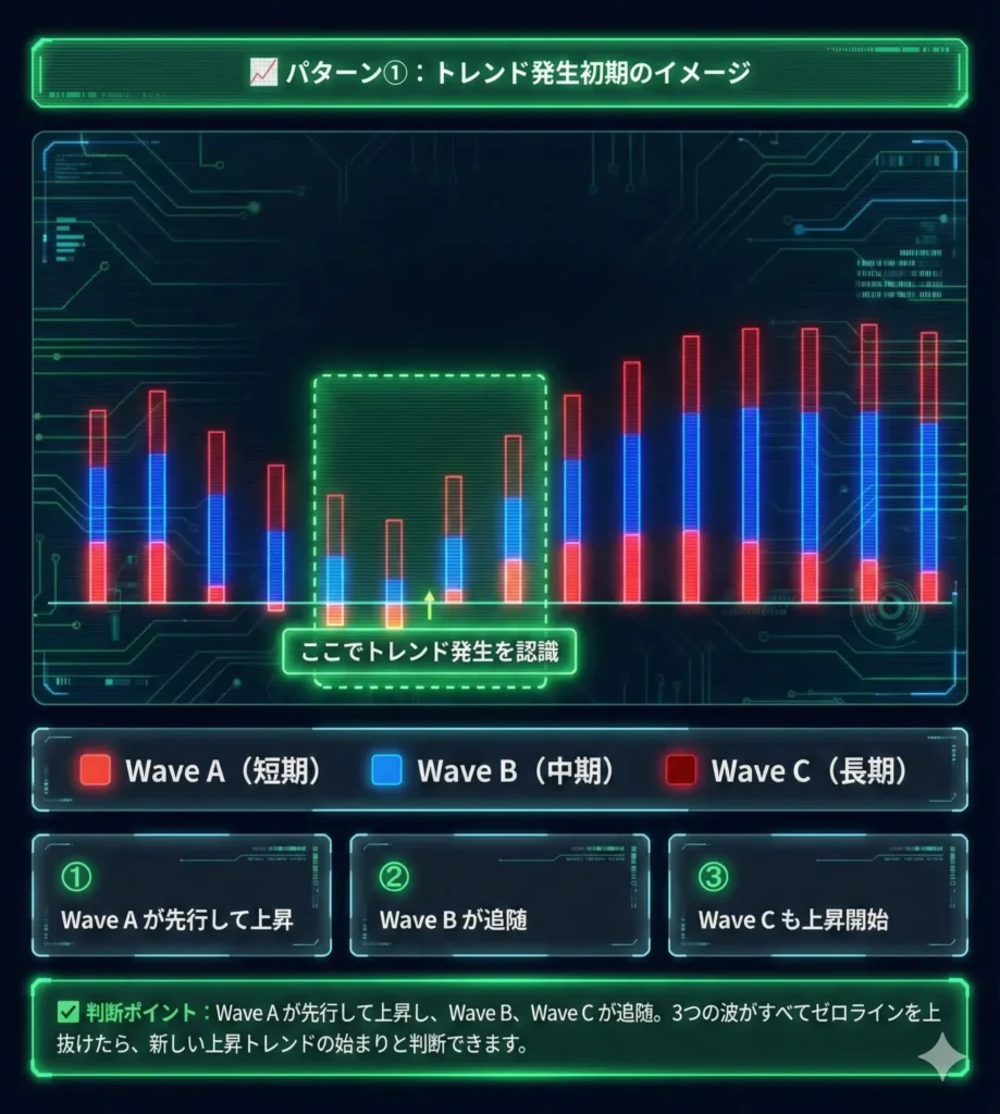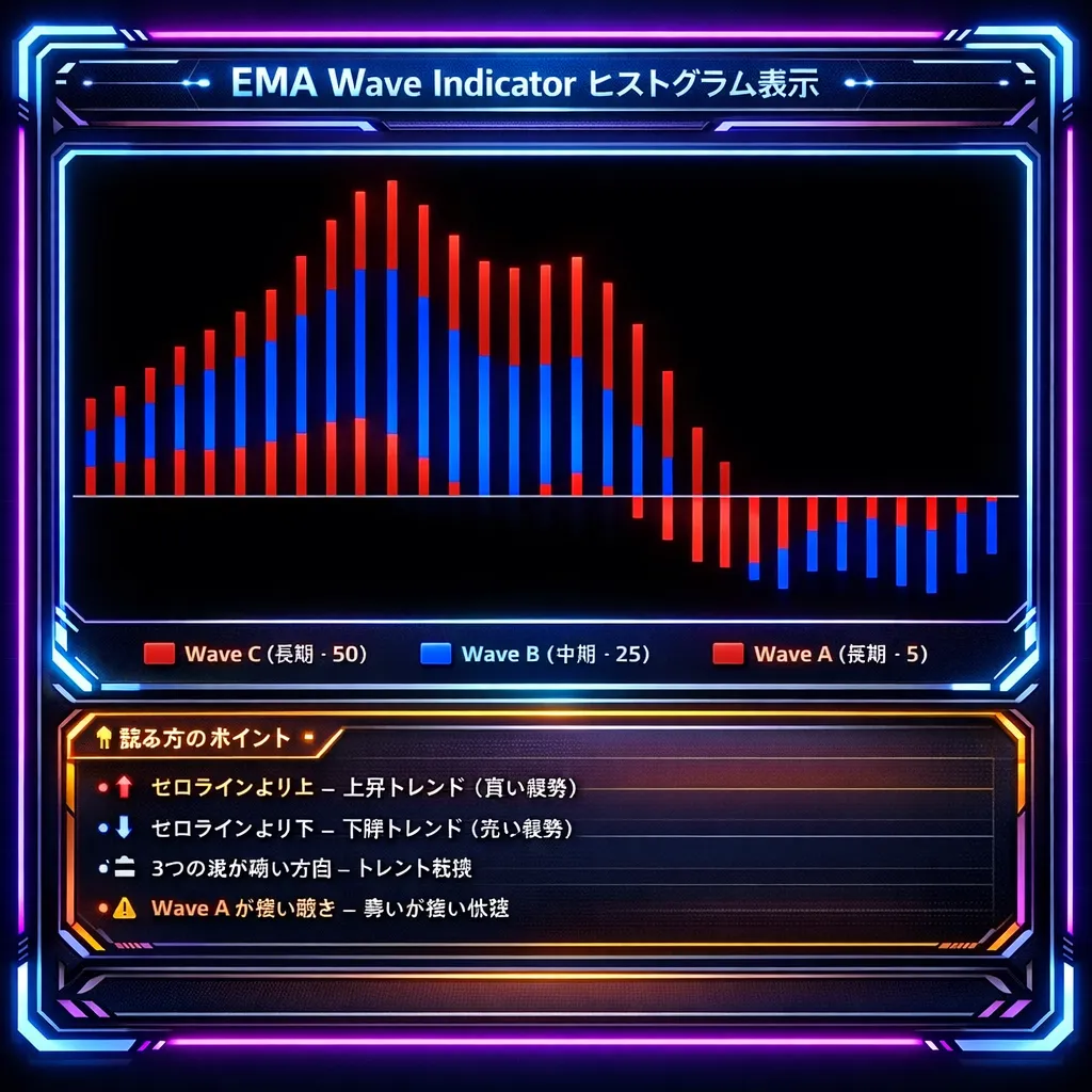 短期・中期・長期の3つの「波(Wave)」をヒストグラムで表示し、それぞれの波の高さと方向からトレンドの強さ・勢い・持続性を一目で把握できます。
