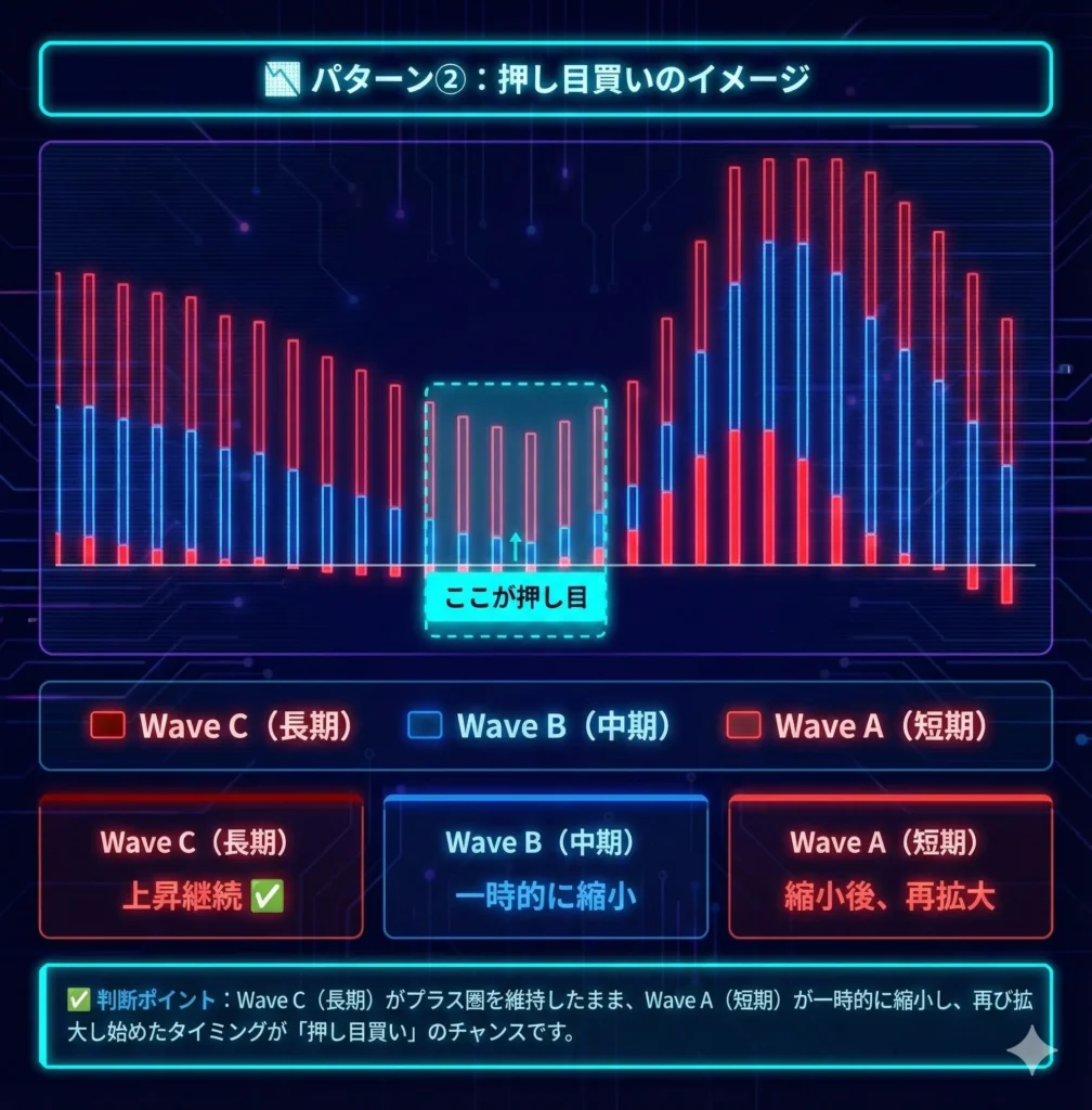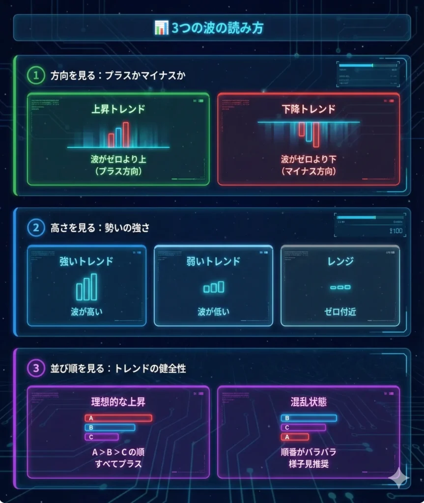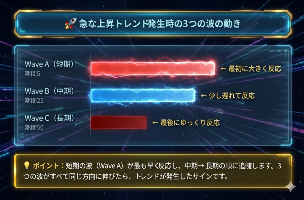 • **3つの波(短期・中期・長期)**でトレンドの強さを多角的に分析