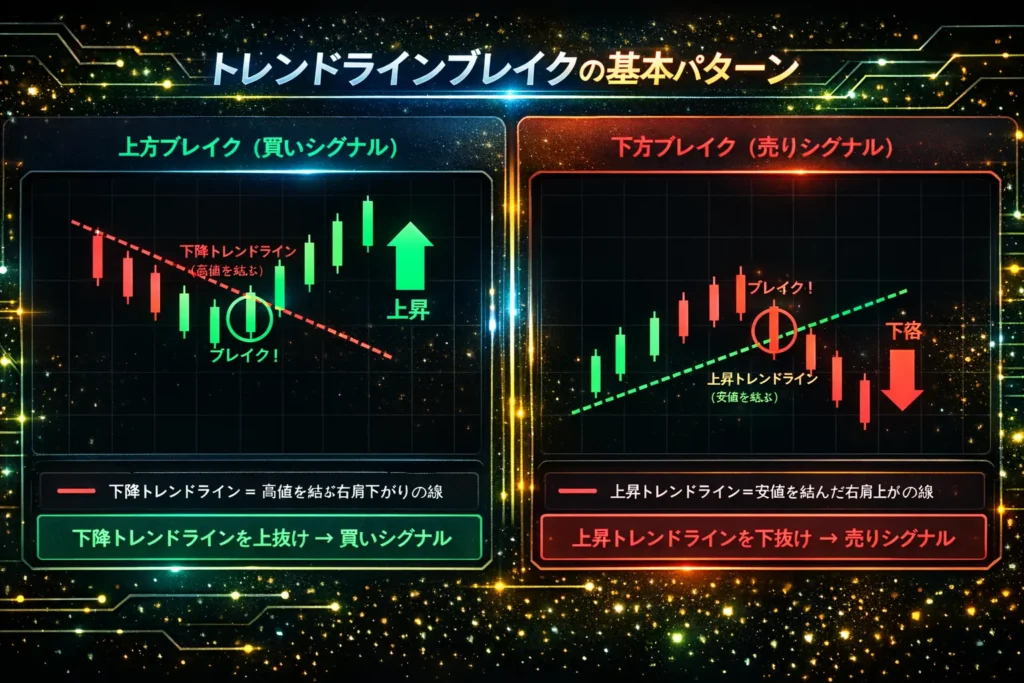 | 下方ブレイク | 上昇トレンドラインを下抜け → 売りシグナル |