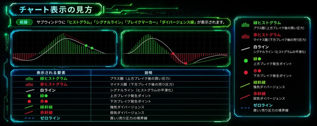 結論:トレンドラインブレイク後の「勢い」をヒストグラムとして表示し、ブレイクの信頼性を視覚的に判断できます。