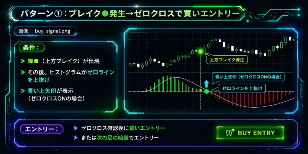 ●はブレイク発生の「通知」です。その後ヒストグラムがゼロラインを超えることで、勢いが確認できます。早めのエントリーを狙うなら●、確実性を重視するならゼロクロスを待ちましょう。