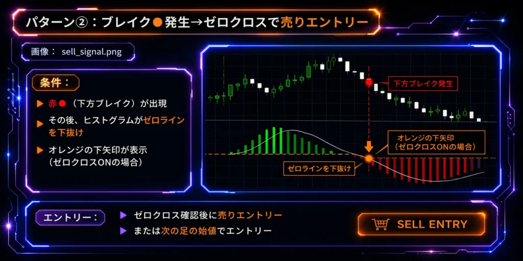 ポイント: ●はブレイク発生の「通知」であり、その後ヒストグラムがゼロラインを超えるかどうかで、エントリー判断ができます。