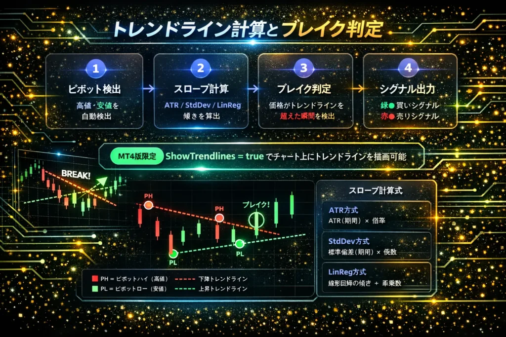 | トレンドライン内部計算 | ピボットハイ・ローから内部的にトレンドラインを計算 | ブレイク判定の基準が明確 |
