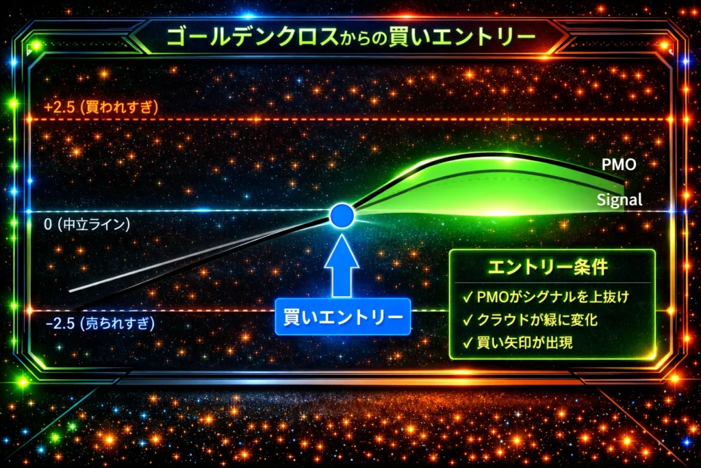 | シグナルラインクロス | PMOとEMAの交差 | 明確なエントリーポイント |