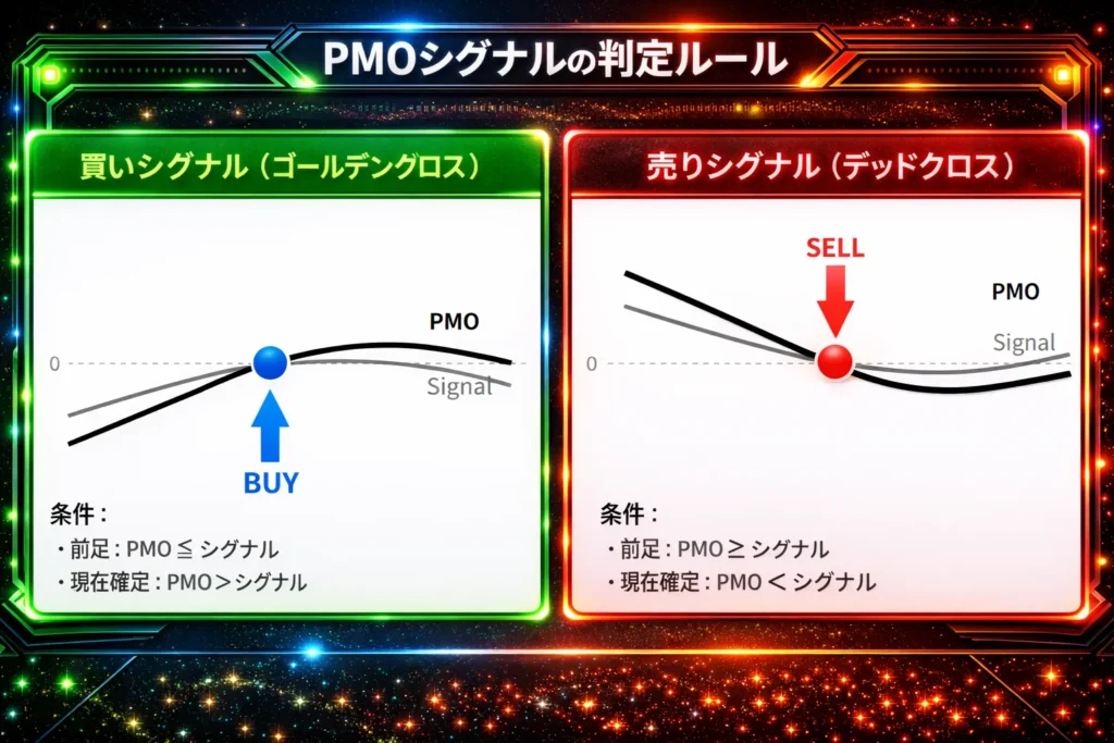 | 🔵 買いシグナル | 前足: PMO ≤ シグナル かつ 現在確定足: PMO > シグナル |