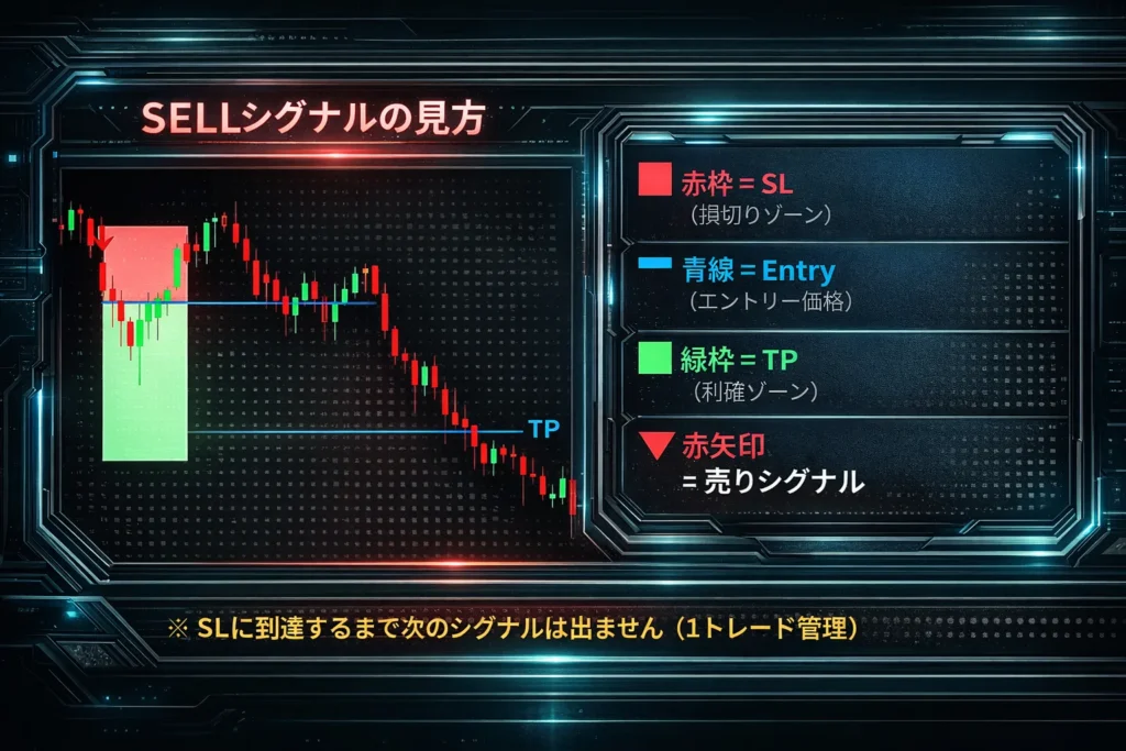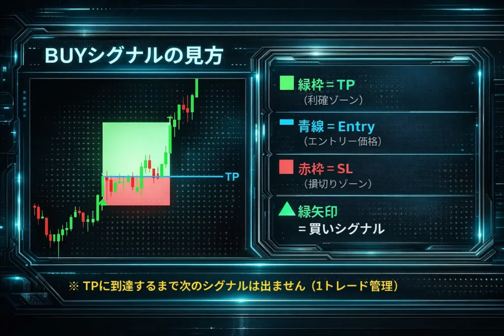 結論:メインチャートには「シグナル矢印」と「SL/TPボックス」が表示されます。