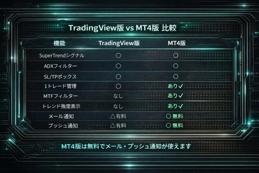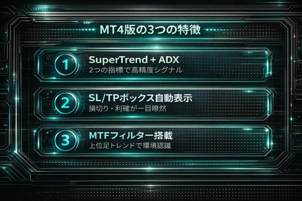 SuperTrendとADXを組み合わせたトレンドフォロー型シグナルに加え、SL/TPボックスの自動表示1トレード管理機能を搭載。さらに、上位足トレンド判定用のMTFインジケーターもセットでお渡しします。