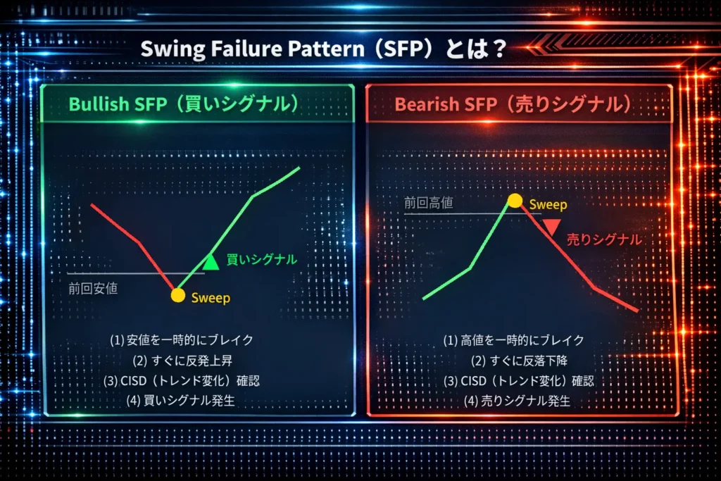 | Bearish SFP(売り) | 高値を一時的にブレイク後、下降反転+CISD確認 | 赤の↓矢印 |