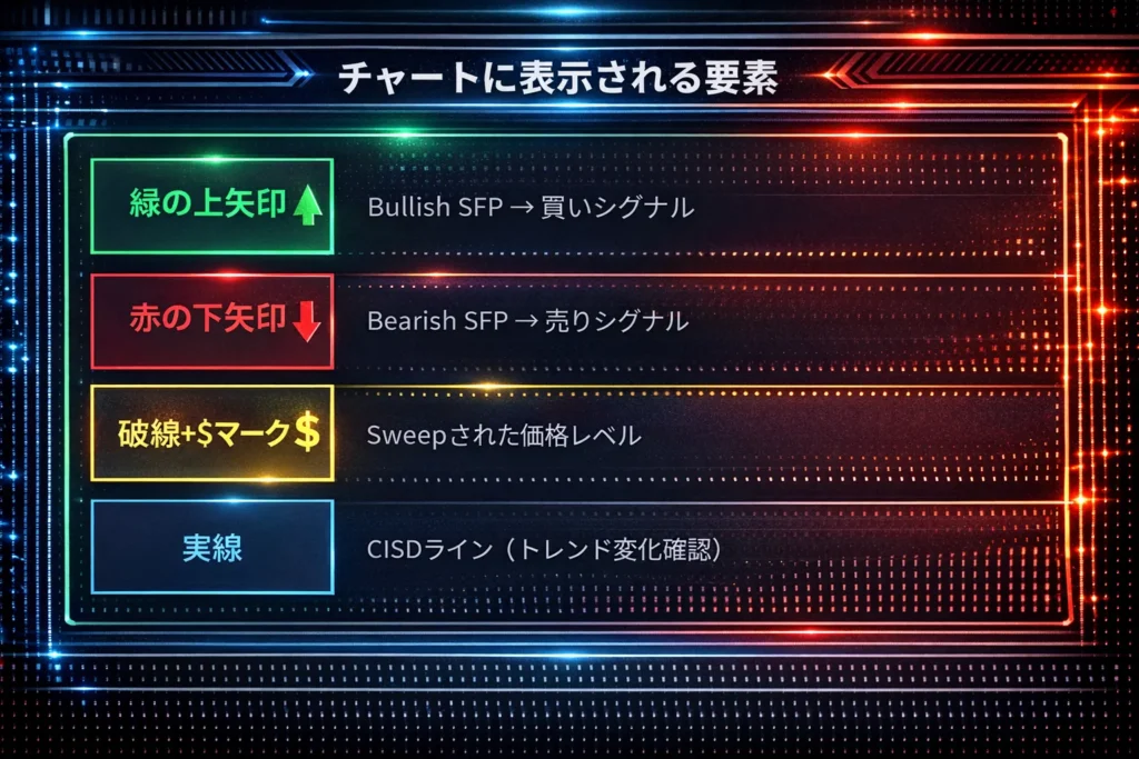 | 赤の↓矢印 | 赤 | Bearish SFP → 売りシグナル |
