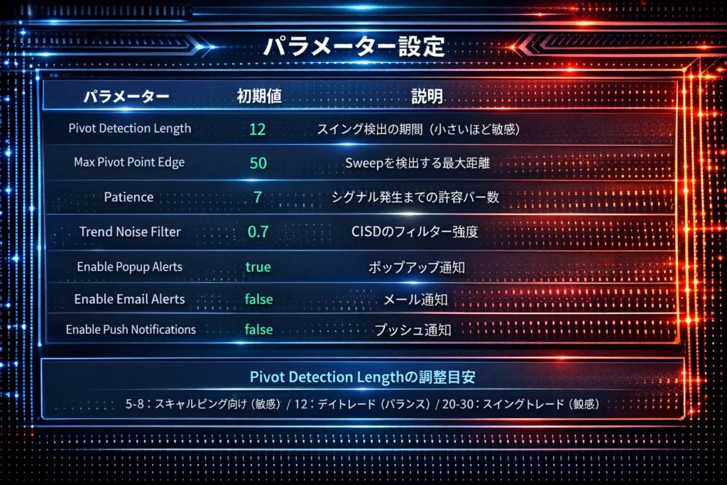 - **スイングポイントのSweep(騙しブレイク)+CISD(トレンド変化)**を検出