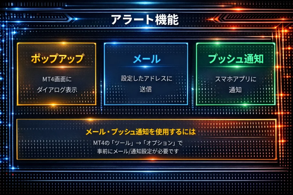 | ポップアップ | MT4画面にアラートダイアログ |