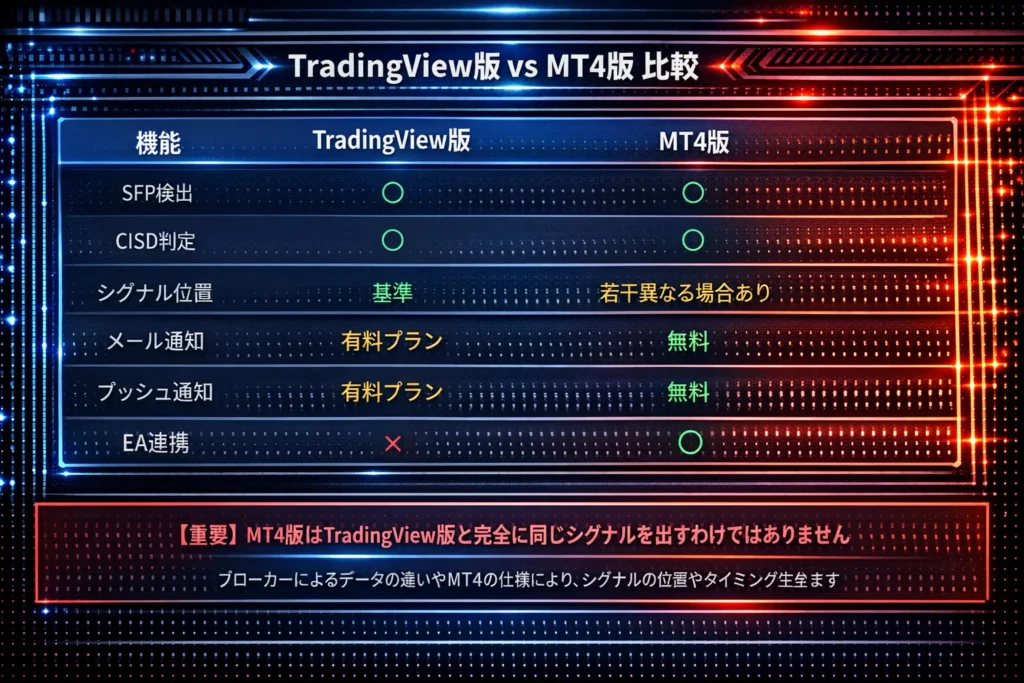 重要: このMT4版はTradingView版のロジックを参考に独自実装したもので、シグナルの発生タイミングや位置がTradingView版と完全一致するわけではありません。ブローカーによるデータの違いや、MT4の仕様に合わせた調整により、差異が生じます。