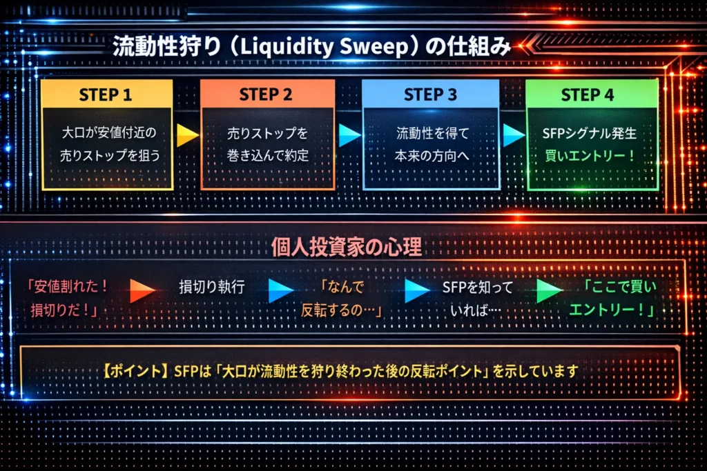 実は、これは**「流動性狩り(Liquidity Sweep)」**と呼ばれる現象で、大口トレーダーが個人投資家のストップロスを狩り取った後に本来の方向へ動く典型的なパターンです。