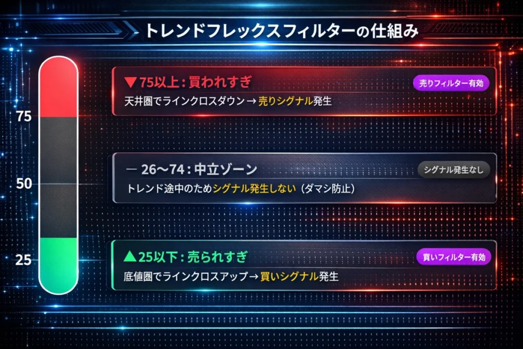 A. TrendFlexが過熱ゾーン(売られすぎ/買われすぎ)に達した時のみシグナルを発生させるフィルターです。