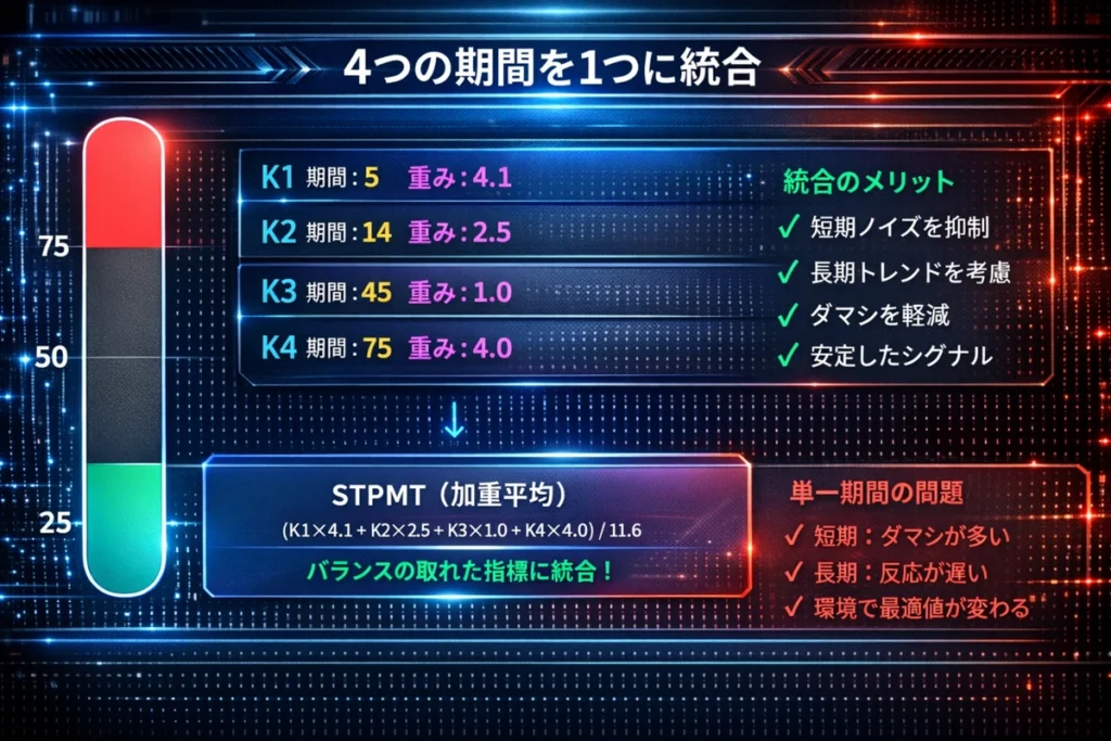 単一期間のストキャスティクスの弱点(ノイズ・遅延)を克服するために、短期〜長期の4つの期間を統合しています。