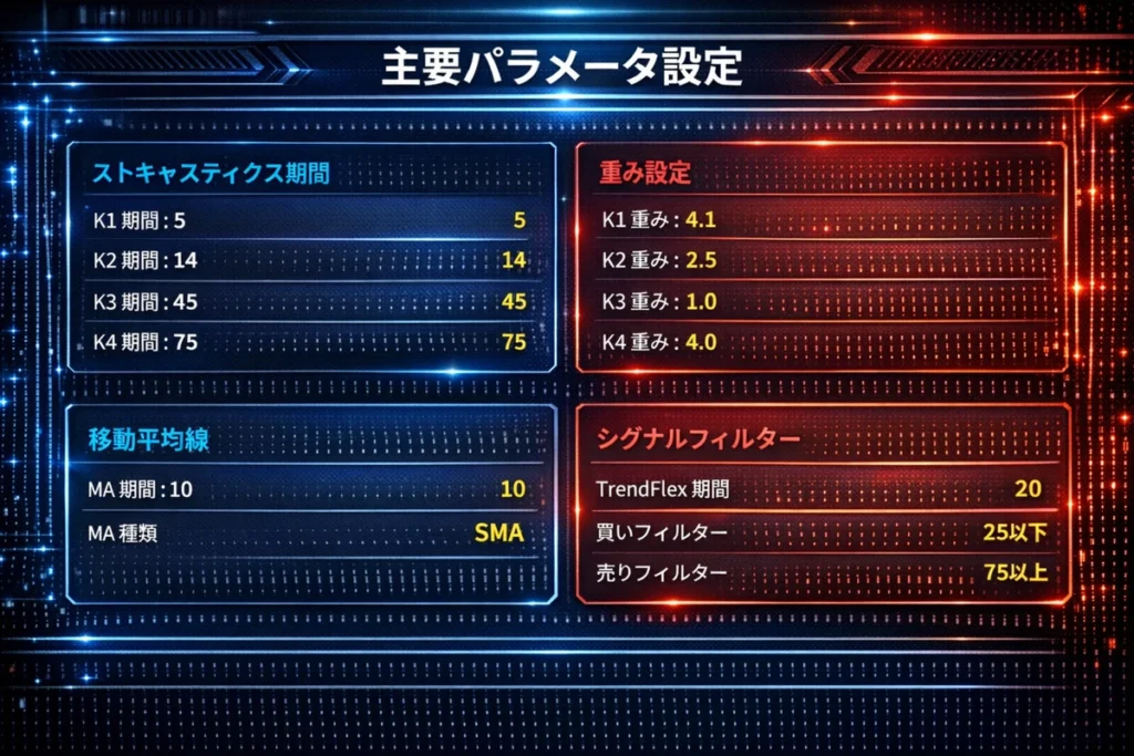 これにより、短期のノイズを抑えつつ、長期トレンドの方向性も考慮したバランスの良いシグナルが得られます。